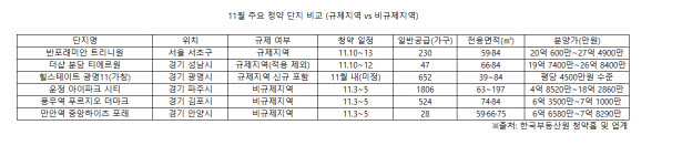 [이데일리 김정훈 기자]2일 한국부동산원 청약홈에 따르면 11월 첫째~둘째 주 수도권 규제지역 내에서 총 5개 단지가 청약 일정을 시작한다. 대표적으로는 △서울 서초구 반포래미안 트리니원 △경기 성남 더샵 분당 티에르원 △경기 광명 힐스테이트 광명11(가칭) 등이 있다.‘로또 청약’으로 불리는 서울 서초구 반포동 ‘래미안 트리니원’은 오는 11일부터 1순위 청약을 받는다. 입지 조건이 우수하고 시세 차익을 기대할 수 있어 수요자들의 관심이 집중된다. 분양가는 전용면적 59㎡ 기준 20억 600만~21억 3100만원, 전용 84㎡는 26억 8400만~27억 4900만원 수준으로 책정됐다.