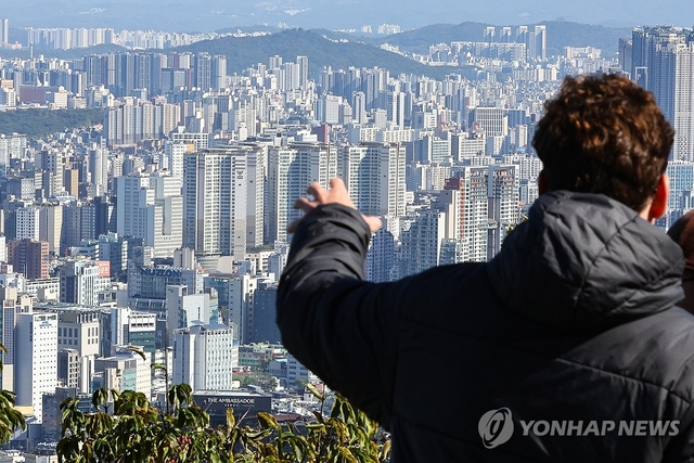 한 시민이 서울 아파트 밀집 지역을 가리키고 있다. [연합뉴스]