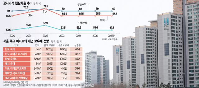 3일 국토교통부에 따르면 정부는 일반 국민과 관계 전문가 등의 의견 수렴을 위한 ‘2026년 부동산 가격 현실화 계획’에 대한 공청회를 13일께 진행할 예정이다. 이날 공청회에서 정부는 내년 공동주택과 단독주택·토지에 대한 공시가격을 올해 수준으로 동결하는 방안을 제안할 것으로 알려졌다. 당초 부동산 공시가격 현실화 계획에 따르면 내년 공동주택 공시가격 현실화율은 80.9%에 달할 예정이었는데 세 부담 등을 고려해 올해와 같은 수준에 묶어두기로 한 것이다. 이에 공동주택의 시세 대비 현실화율은 4년 연속 69%가 적용된다. 토지와 단독주택 역시 4년째 각각 65.5%, 53.6% 수준으로 동결되며 올해 시세 변동만 공시가격에 반영될 예정이다. 부동산 공시가격은 재산세·종합부동산세 등의 과세 기준이 되며 건강보험료·기초연금 등 67개 행정제도의 기초 자료로 활용되는 핵심 자료다.