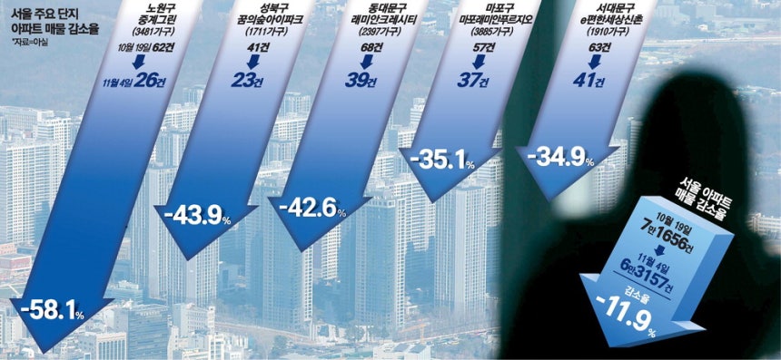 10·15 부동산 대책 영향으로 인해 서울 아파트 매물이 급감하고 있다. 지난달 20일부터 서울 전역이 규제지역과 토지거래허가구역(토허구역)으로 지정되는 사상 초유의 부동산 규제가 시행되면서 전세를 끼고 집을 사는 갭투자에 제동이 걸리고 대출 규제로 갈아타기도 어려워진 집주인들이 매물을 속속 거둬들이고 있기 때문이다. 거래절벽이 심화하고 있지만 주택 수요자들의 매수세와 호가를 올리며 관망세로 돌아선 매도자로 인해 매매 가격은 오르는 모양새다. 지난 3월부터 토허구역으로 묶인 강남3구(강남·서초·송파구)와 용산구처럼 간헐적으로 발생하는 고가 거래가 시장을 왜곡할 수 있다는 우려가 나오고 있다.