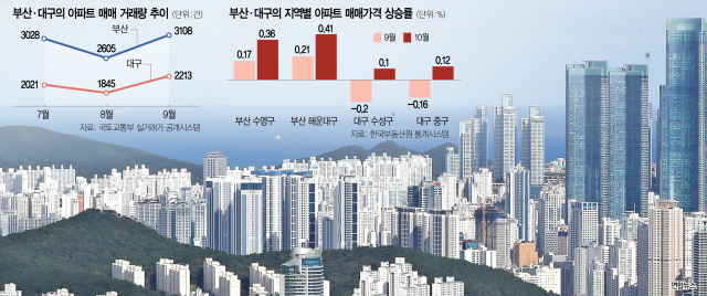 지방 핵심지의 아파트 매매 거래가 늘면서 가격도 상승 흐름을 나타내고 있다. 한국부동산원에 따르면, 9월 부산 수영구 아파트 매매가격 상승률은 0.17%였으나 지난달 0.36%로 2배가량 늘었다. 해운대구 아파트 매매가격 상승률 역시 9월 0.21%에서 10월 0.41%로 급증했다. 특히 해운대구 아파트 매매가격은 ‘10·15 부동산 대책’ 발표 이후인 지난달 셋째주와 넷째주에 각각 0.03%, 0.08% 오르며 연속 상승세를 보였다. 국토교통부 실거래가 공개시스템에 따르면 준공 15년차 부산 해운대구 우동 ‘해운대아이파크’ 전용 126㎡은 지난달 26일 직전 최고가보다 2억 1000만 원 오른 24억 원에 매매 계약이 체결됐다. 부산 남구 용호동의 주상복합 ‘더블유’ 전용 165㎡는 이달 1일 33억 7500만 원의 신고가에 거래됐다.