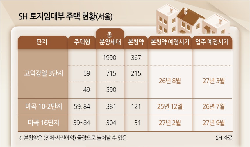 6일 서울주택도시개발공사(SH)에 따르면 다음달 강서구 마곡 10-2단지는 59·84㎡ 121호에 대한 본청약을 진행할 예정이다. 입주 예정시기는 2026년 7월로 자세한 토지 임대료는 본청약 때 공개된다. 사전예약 부적격 및 포기 물량은 본청약 물량으로 전환돼 모집세대 수가 증가할 수 있다.
