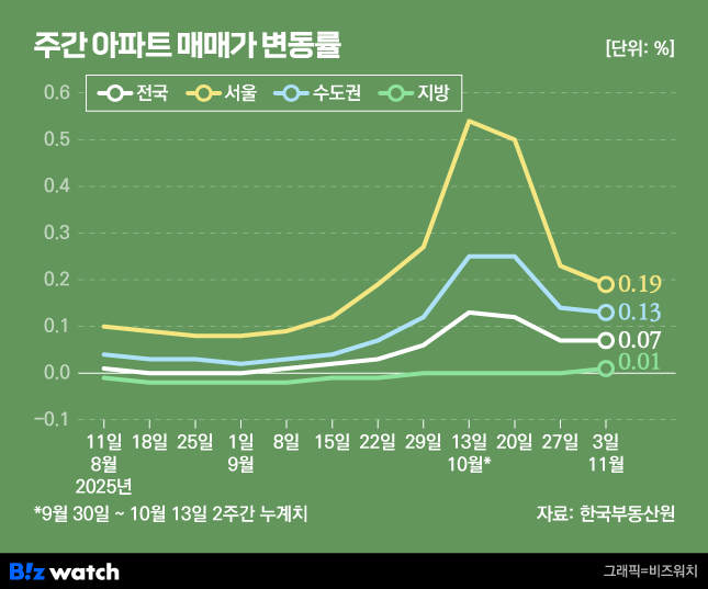 주간 아파트 매매가 변동률./그래픽=비즈워치송파·동작, 노후 아파트 뛴다한국부동산원의 11월 첫째 주(3일 기준) 아파트 가격 동향에 따르면 서울 아파트 매매가격이 일주일 새 0.19% 올랐어요. 전주 상승률(0.23%)과 비교하면 0.04%포인트 낮아진 수치에요.