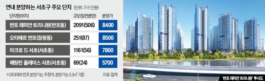 ◇서초구에서 잇단 분양7일 분양업계에 따르면 다음주 반포 래미안 트리니원 청약을 하고 다음달에는 오티에르 반포, 아크로 드 서초 등 서초구에서 분양이 이어진다. 오는 11일 1순위 청약을 받는 반포 래미안 트리니원은 전체 2091가구 가운데 일반분양 물량이 506가구(전용면적 59~84㎡)에 달해 수요자 관심이 크다. 이 단지는 반포아파트 제3주구 재건축 사업을 통해 공급되는 단지다.분양가상한제가 적용돼 주변 시세의 50~60% 가격으로 공급된다. 전용 59㎡ 분양가는 19억~21억원대, 전용 84㎡는 26억~27억원대로 책정됐다. 2016년 준공된 인근 아파트인 ‘아크로리버파크’ 전용 84㎡는 지난 9월 56억원에 거래됐다. 박지민 월용청약연구소 대표는 “반포 래미안 트리니원은 20억원 이상 시세 차익이 예상돼 청약 만점 통장도 등장할 것으로 보인다”며 “분양 물량이 500여 가구로 많아 최저 당첨 가점은 다소 낮아질 수 있지만, 4인 가족 만점 기준인 69점가량이 될 것”이라고 내다봤다.