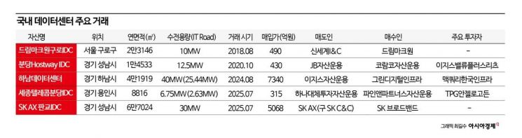 'AI 머니'에서 막대한 자금이 들어오고 있다. 2020년 이전만 해도 1년에 한두 건 정도 거래가 이뤄졌으나, 수도권을 중심으로 대형 거래가 성사되고 있다. 2018년 신세계I&C가 보유하던 '드림마크원 구로 IDC'는 490억원에 드림마크원으로 넘어갔다. 2020년에는 JB자산운용이 보유한 '분당 Hostway IDC'가 코람코자산운용으로 매각됐다. 지난해 8월에는 매쿼리한국인프라가 참여한 '하남 데이터센터'(7340억원)가 팔렸다. 올해 7월에는 'SK AX 판교 IDC'(5068억원)가 SK브로드밴드로, '세종텔레콤 분당 IDC'(315억원)가 파인앤파트너스자산운용으로 각각 손바뀜했다.