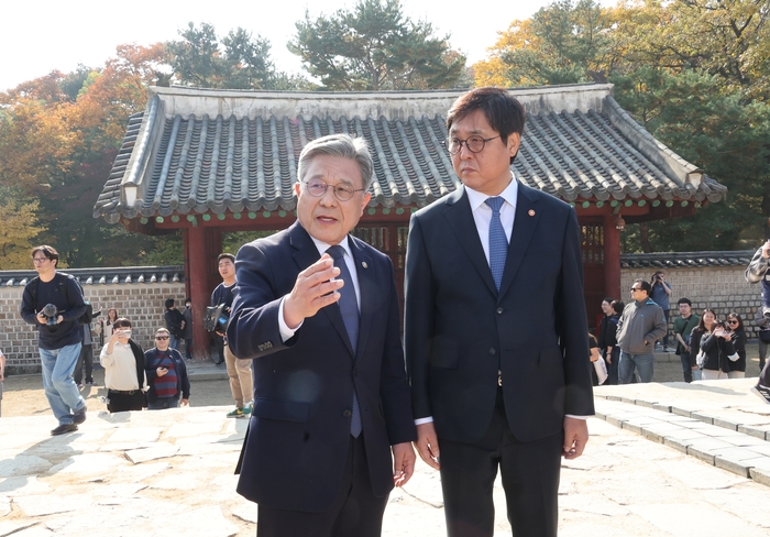 최휘영 문체부 장관은 7일 종묘 정전에서 기자회견을 갖고 “장관으로서 취할 수 있는 모든 수단을 강구해 우리 문화유산을 지키는 일에 앞장서겠다”고 말했다. 기자회견에 같이 참석한 허민 국가유산청장은 “종묘가 유네스코 세계유산 ‘위험 목록’에 오를 수 있다”고 다시 한번 경고했다.
