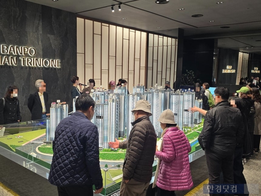 서울 서초구 반포동 '반포 래미안 트리니원' 모형도를 보는 예비 청약자. 사진=이송렬 기자.지난 7일 찾은 서울 송파구 장지동에 있는 래미안 갤러리. 아침부터 모델하우스를 둘러보기 위해 몰린 예비 청약자로 내부가 시끌벅적했다. 아기를 데리고 온 신혼부부부터 나이가 지긋한 노부부까지 반포 새 아파트에 관심이 많은 모습이었다.삼성물산이 반포3주구를 재건축해 짓는 '반포 래미안 트리니원'은 올해 하반기 청약 시장 최대어로 꼽힌다. 각종 부동산 대책으로 시장이 얼어붙은 단지에서 나오는 강남권 대형 단지라 청약 흥행할 것인지를 두고 관심이 많다.전용 84㎡ 분양받으려면 25억원 넘게 있어야, 대신 시세 차익도 30억원반포3주구는 반포주공1단지의 일부다. 반포주공1단지는 반포본동 전체에 걸쳐져 있었는데 부지가 워낙 거대하다 보니 총 4개 주구로 나뉘어 있었다. 한강과 맞닿아 있는 1·2·4주구는 이해관계가 첨예가 충돌하면서 갈등을 지속했다. 반포천을 접하고 있는 3주구는 이들과 따로 재건축을 진행하게 됐고, 반포 래미안 트리니원으로 다시 태어나게 됐다.