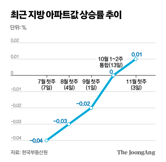 김주원 기자 지지부진했던 지방 아파트 시장이 일부 지역을 중심으로 꿈틀대고 있다. 9일 한국부동산원에 따르면 이달 첫주(3일 기준) 지방 아파트 매매가격은 전주보다 0.01% 상승했다. 서울ㆍ수도권과 비교하면 오름폭이 낮지만, 2023년 11월 이래 99주만의 상승 전환이라는 점에서 의미가 있다. 이 기간 지방 아파트값은 보합 또는 하락을 지속했다.