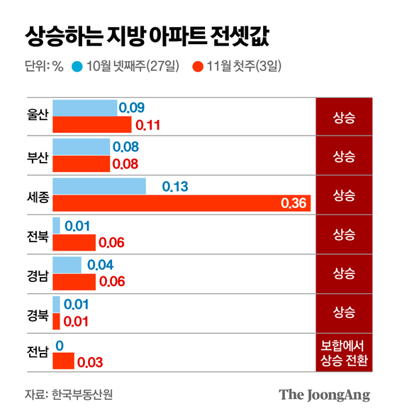 이는 그간 부동산 프로젝트파이낸싱(PF) 부실화 우려로 신규 착공이 줄어든데다, 수도권에 비해 상대적으로 저평가 받았다는 평가가 나오면서 지방 일부 지역을 중심으로 매수세가 살아나고 있는 것으로 풀이된다. 여기에 ‘10ㆍ15 부동산 안정화 대책’ 이후 규제가 덜한 지방 핵심 지역을 중심으로 풍선효과가 나타날 수 있다는 기대감도 퍼지고 있다.