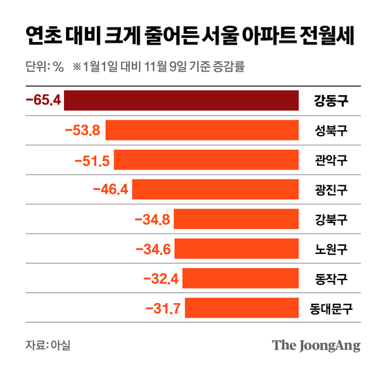 강동구 전월세 물량은 연초 6000여 건에서 이달 2000여 건으로 급감했다(-65%). 성북구도 1400여 건에서 660여 건(-54%)으로 매물이 크게 줄었고, 관악구(-52%), 광진구(-46%), 강북·노원구(-35%) 등도 감소 폭이 상당하다. 서울 25개 자치구 중 강남·서초·송파구 등을 제외한 19개 자치구 전월세 물량이 연초 대비 줄어든 것으로 나타났다. 서울 아파트 전세가격은 40주째 오름세다.