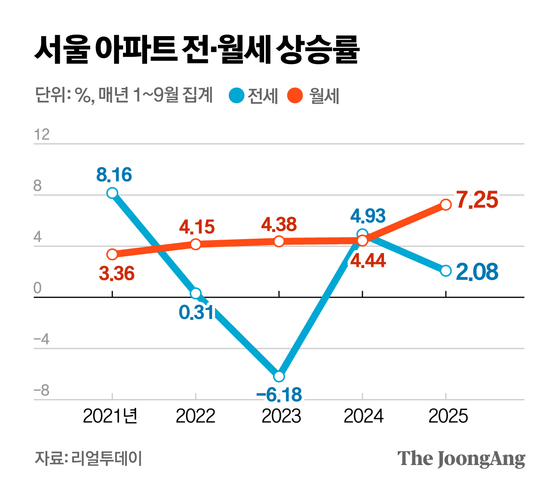9일 KB부동산에 따르면 지난달 전세수급지수는 157.72을 기록해, 2021년 10월(162.25) 이후 4년 만에 최고치를 기록했다. 전세수급지수는 100을 기준으로 이보다 높으면 수요가 공급보다 많다는 의미다. 서울 아파트 전월세 물량은 올해 초 5만1897건에서 9일 현재 4만8918건으로 5.8% 줄었다(부동산 플랫폼 아실 집계). 특히 강북 지역 전·월세가 크게 줄고 있다.