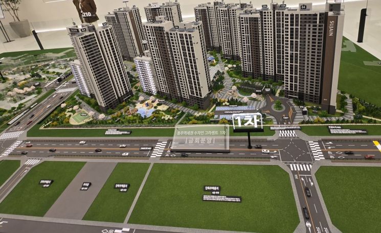 경기 김포시 '풍무역세권 수자인 그라센트 1차'모형도. 단지 왼편에는 수자인 그라센트 2차 단지가 들어설 예정이다. 앞쪽 부지는 단독주택 용지로 계획돼 개방감이 뛰어나고 조망권이 확보된 것이 특징이다. 최서윤 기자