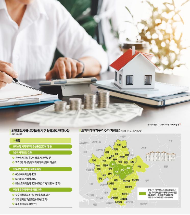 민간 아파트 가점제 적용 비율도 높아졌다. 전용 60㎡ 이하는 가점제 40%, 60~85㎡는 가점제 70%, 85㎡ 초과는 80%로 정해져 있다. 비규제지역에서 85㎡ 이하 가점제 40%, 85㎡ 초과는 추첨제로만 뽑는 것과 다르다. 추첨으로 공급하는 물량도 75%는 무주택자에게, 25%는 1주택자에게 먼저 돌아간다. 청약에 당첨된 이후에도 3년간 전매제한(지방 1년)이 적용된다. 재당첨 제한은 10년, 부적격 재당첨 제한도 1년이다.