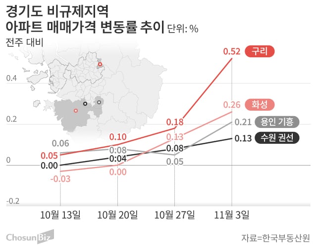 13일 한국부동산원이 발표한 11월 1주(3일 기준) 주간 아파트 가격 동향 자료에 따르면 비규제 지역인 경기 구리시는 전주 대비 아파트 매매 가격 상승률이 0.52%를 기록했다. 10·15 부동산 대책 발표 전인 10월 2주 차(0.05%)와 비교해 상승률이 10배 이상 뛰었다. 규제지역에서 빠진 동탄을 포함한 경기 화성시 역시 같은 기간 아파트 매매 가격 상승률이 -0.03%에서 0.26%로 올랐다. 떨어지던 집값이 상승 전환했단 뜻이다.