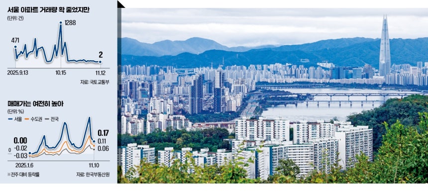 정부 규제로 거래량이 급감한 가운데서도 집값이 높은 수준을 유지하는 ‘고원 현상’이 수도권 부동산 시장에서 나타나고 있다. 수요는 그대로인데 대출 규제와 토지거래허가 등으로 매매를 막고 있기 때문이란 지적이다. 전·월세 가격 상승 속에 공급 확대책이 필요하다는 목소리가 힘을 얻고 있다. ◇구청에 토지거래허가 신청 쌓여국토교통부 실거래가 공개시스템에 따르면 10·15 대책 시행 후 29일(10월 16일~11월 12일) 동안 등록된 서울 아파트 거래량은 2508건으로 직전 29일(1만636건)보다 76%(8128건) 줄었다. 서울 전역이 토지거래허가구역으로 지정된 지난달 20일부터는 784건에 그쳤다. 이마저도 송파(329건), 강남(144건), 서초(77건) 등 강남 3구를 제외하면 234건에 불과하다. 대출 축소와 2년 실거주 요건으로 ‘갭투자’(전세 끼고 매매)가 차단돼 매매가 쉽지 않아졌기 때문이다. 집을 팔고 다른 집으로 이사 가기도 힘들어지면서 매물도 줄고 있다. 부동산정보업체 아실에 따르면 13일 기준 서울 아파트 매물은 6만2893개다. 지난달 15일 7만4044개에서 한 달 만에 15%(1만1151개) 줄었다.