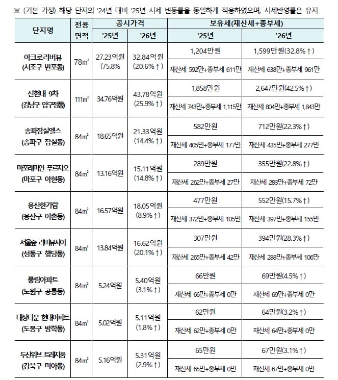 주요단지 공시가격 변동률 및 보유세액 추정. /국토교통부 제공