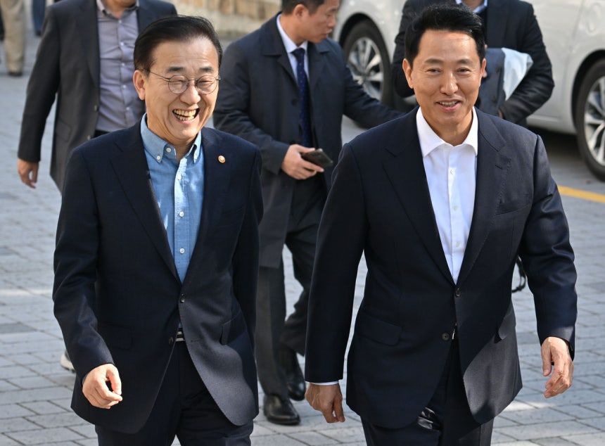 김윤덕(왼쪽) 국토교통부 장관과 오세훈 서울시장이 13일 서울 중구 달개비에서 오찬회동을 마친 뒤 취재진을 만나기 위해 이동하고 있다. 임세준 기자