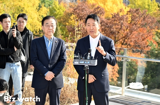 오세훈 서울시장(오른쪽)과 김윤덕 국토교통부 장관이 13일 오찬 회동을 마친 뒤 취재진과 질의응답하고 있다./사진=국토교통부소통부재 논란에 '상시 협의 채널' 구축