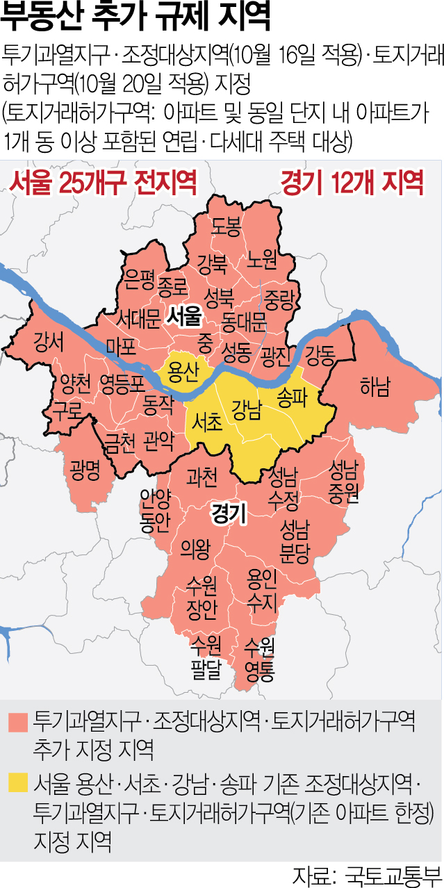 10·15 대책 전까지 규제지역은 서울 강남 3구와 용산구 등 네 곳이 전부였습니다. 국토부가 여기에 더해 새로 지정한 지역은 서울 21개 구와 경기 12곳(과천시, 광명시, 성남시 분당·수정·중원구, 수원시 영통·장안·팔달구, 안양시 동안구, 용인시 수지구, 의왕시, 하남시 등)입니다. 기존 지역까지 합치면 총 37곳이 규제지역이 된 것이지요.