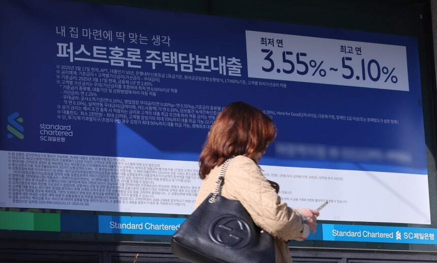 서울 시내 한 은행에 주택담보대출 금리 안내문이 붙어 있다. 남정탁 기자 16일 금융권에 따르면 KB국민·신한·하나·우리은행의 14일 기준 주택담보대출 혼합형(고정) 금리(은행채 5년물 기준)는 연 3.930∼6.060% 수준이다. 4대 은행에서 6%대 혼합형 금리는 지난 2023년 12월 이후 약 2년 만에 처음이다.