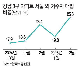 지방 거주자의 서울 강남 3구(강남·서초·송파구) 아파트 매수는 지난해 말부터 올해 초에 두드러진 것으로 확인됐다. 한국부동산원에 따르면 올해 2월 강남 3구 아파트 구매자 중 서울 외 거주자가 차지하는 비중은 25.5%로 집계됐다. 지난해 9~11월엔 외지인 비중이 17~18%에 불과했지만, 올해 2월 들어서는 7~8%포인트가량 외지인 매입 비중이 커진 셈이다.