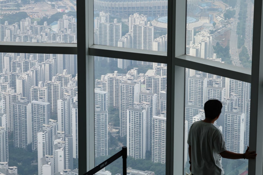 서울 송파구 롯데월드타워 전망대 서울스카이에서 바라본 서울 시내 아파트 단지 모습 . [연합]