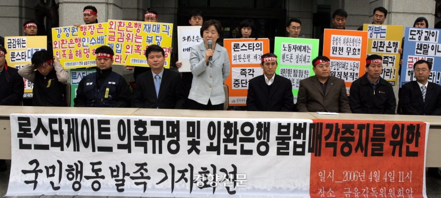 론스타 불법매입 의혹 규명 및 외환은행 불법매각 중지를 위한 국민행동 회원들이 2006년 서울 여의도 금융감독위원회 앞에서 집회를 열고 론스타에 대한 사법처리를 촉구하고 있다. 김정근 기자론스타는 2010년 다시 매각을 시도했다. 당시 하나은행에 4조6888억원에 넘기는 계약을 했지만 한국 정부가 외환카드 주가 조작 판결 등을 이유로 매각 승인을 미뤘다. 론스타가 2003년 외환은행 자회사이던 외환카드를 합병하는 과정에서 감자설을 퍼뜨려 주가를 조작한 혐의가 인정돼 2011년 유죄 판결이 났다. 당시 금융당국은 외환카드 주가 조작 유죄 판결로 론스타가 대주주 자격을 잃었다며 6개월 이내 주식을 처분하라고 명령하기도 했다.