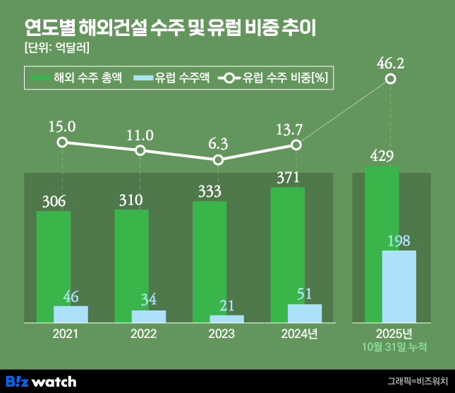 그 덕에 지난해 10월 말 기준 비중이 11%에 불과했던 유럽 지역 수주액이 올해는 46.2%로 대폭 확대됐다. 금액 또한 지난해 31억2974만달러에서 올해 198억1932만달러로 6배 넘게 폭증했다.