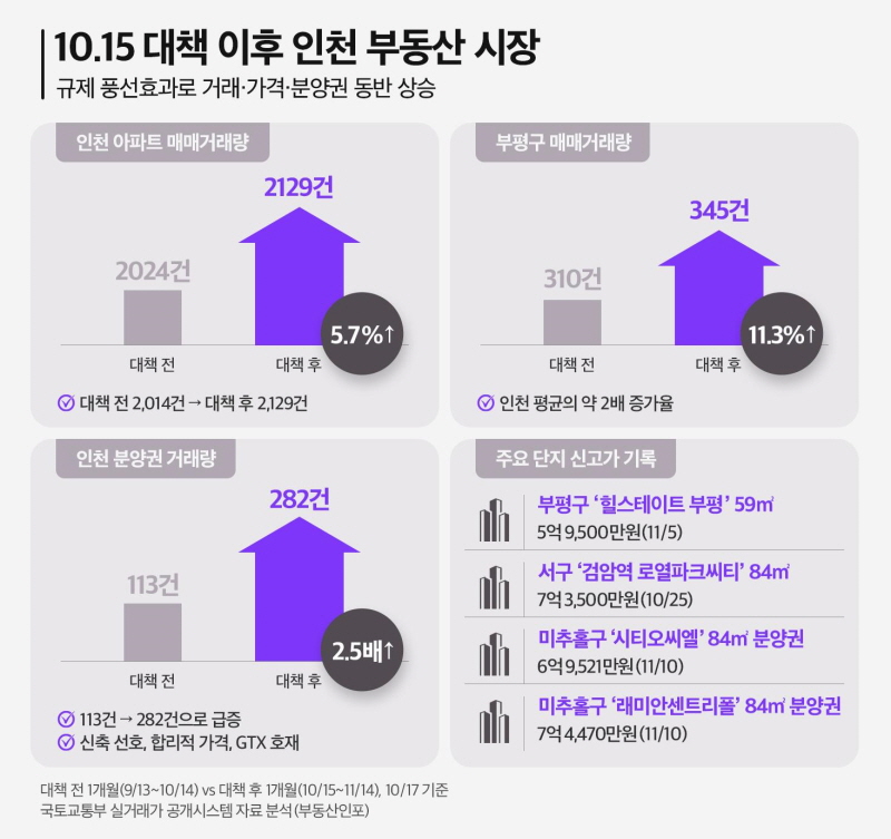 부동산시장 분석업체 부동산인포가 국토교통부 실거래가 공개시스템 자료를 분석한 결과, 10.15 대책 발표 이전 1개월(9월 13일~10월 14일) 동안 인천의 아파트 매매거래량은 2,014건을 기록했다. 그러나 대책 발표 이후 1개월(10월 15일~11월 14일) 동안에는 2,129건이 거래되며 5.7% 증가한 것으로 집계됐다. 같은 기간 서울 등 규제지역 거래가 멈춘 것과는 대조적이다.