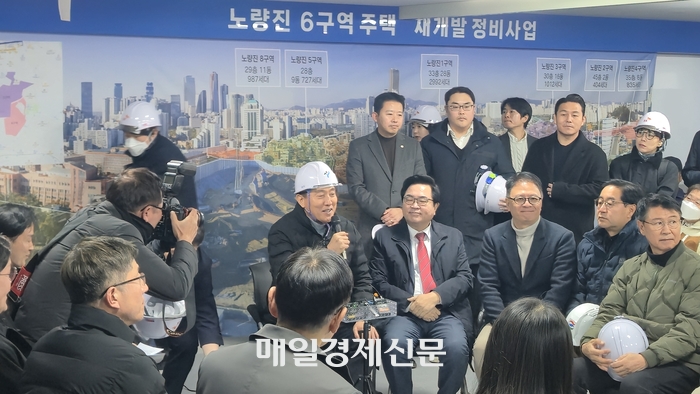 오세훈 서울시장과 관계자들이 19일 오후 노량진6구역 공사현장을 찾아 주민 간담회를 진행하고 있다 [한창호 기자]이날 현장에서 진행된 주민간담회에서는 정부의 10·15 부동산 대책이 정비사업에 줄 수 있는 부정적 영향에 대한 우려의 목소리와 지난주 오 시장과 김윤덕 국토교통부 장관의 회동과 관련한 설명도 나왔다.