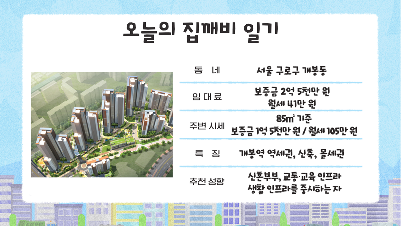 이 단지는 지하철 1호선 개봉역 역세권으로 직주근접성이 뛰어나다. 개봉역에서 영등포역까지 10분, 서울역까지 25분 소요된다. 환승하면 여의도나 강남까지도 20~40분 내 도착할 수 있다. 이들은 "가성비, 역세권, 신축 등 단지의 장점이 많다"며 "신혼부부들에게 강력 추천한다"고 전했다.