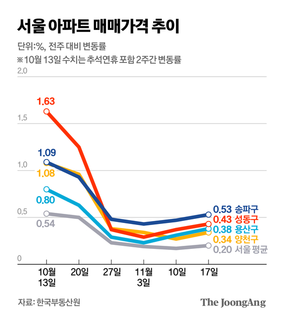 20일 한국부동산원이 발표한 주간 아파트 가격 동향조사에 따르면 11월 셋째 주(11월 17일 기준) 서울 아파트 평균 매매가격은 전주 대비 0.20% 올랐다. 10·15 대책 발표 후 서울 아파트값은 0.23%→0.19%→0.17%로 3주 연속 둔화했지만 4주 만에 상승 폭이 다시 커진 것이다.
