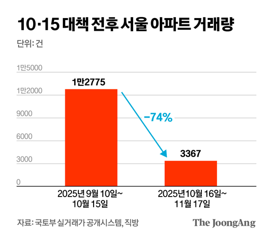 서울 중구 남산에서 바라본 아파트 단지의 모습. 뉴스1 10·15 부동산 대책이 시행된 지 한 달 만에 서울 아파트값 상승 폭이 확대됐다. 정부가 서울 전역과 경기 12곳을 ‘3중 규제’(조정대상지역·투기과열지구·토지거래허가구역)로 묶는 고강도 대책을 내놨지만 집값이 쉽게 잡히지 않는 모습이다. 다만 매물·거래량이 크게 줄면서 수급 불일치로 인한 가격 상승이란 분석도 나온다. ━