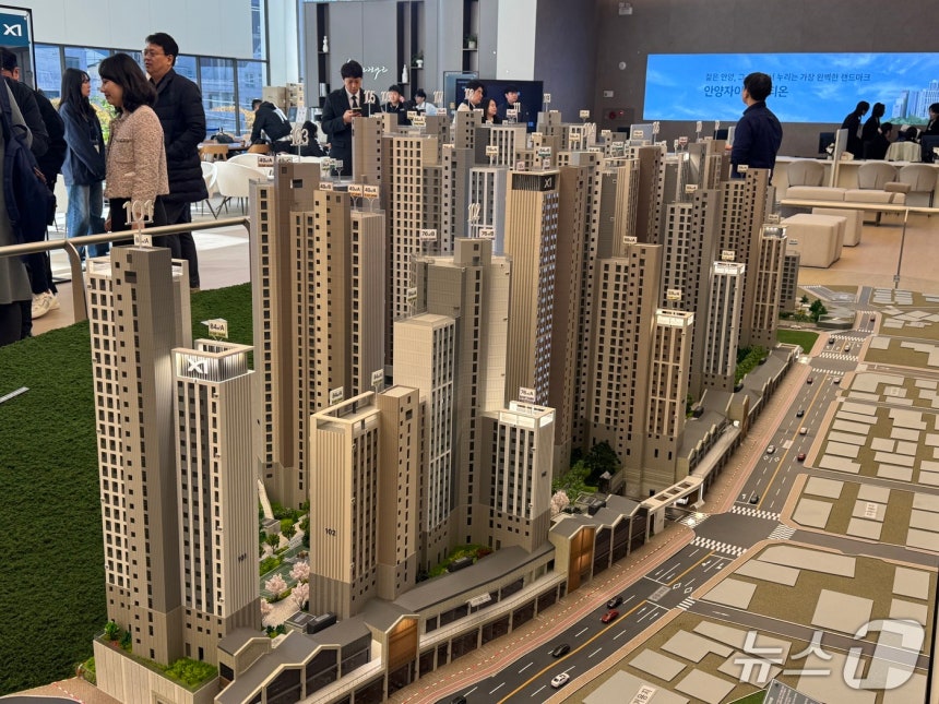 21일 방문한 경기 안양 만안구 '안양자이 헤리티온' 견본주택 내부의 단지 모형 2025.11.21/뉴스1 ⓒ News1 윤주현 기자(서울=뉴스1) 윤주현 기자 = 1호선 명학역 1번 출구를 나서 주거지 골목을 따라 5분 정도 걷자, '안양자이 헤리티온' 견본주택이 모습을 드러냈다. 비규제 지역의 대표 수혜지답게, 견본주택 오픈과 동시에 방문객들의 발길이 이어졌다.