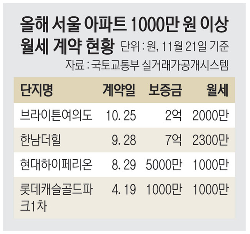 ‘한달에 1000만원 이상’ 서울전역 초고가 월세 속출