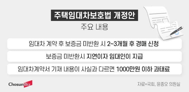 개정안에선 임대차 등기(임차권 설정 등기)를 설정한 임차인이 임대차계약이 끝난 후부터 3개월이 지나도록 보증금(일부 또는 전부)을 돌려받지 못하면 집을 경매에 넘길 수 있도록 했다. 또 보증금을 반환하지 않은 임대인이 미반환 보증금에 대한 지연 이자를 임차인에게 지급하도록 하는 방안도 법안에 포함됐다.