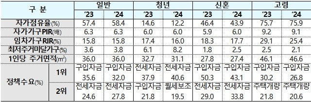 청년·신혼부부 주거 여건은 악화하는 추세다. 1인당 주거 면적은 전년과 비슷한 수준이었지만, 가구당 면적은 소폭 감소한 것으로 집계됐다. 청년 가구는 임차비중이 82.6%에 달했고, 주택 이외 거처(고시원, 컨테이너 등) 거주 비율이 5.3%로 전체 평균(2.2%)보다 높았다. 오피스텔을 포함하면 청년 10명 중 2명(17.9%)은 비주택에 거주하고 있다. 반면 고령가구는 주거 여건이 개선됐다.
