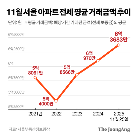 26일 서울부동산정보광장에 따르면 이달 25일 기준 서울 아파트 전세 평균 거래금액은 6억3683만원으로 지난해 같은달 대비 3.7%가량 상승했다. 2011년 관련 통계 집계 이후 최고가다. 전세 평균 거래금액이란 서울시 내에서 일정 기간 거래된 모든 아파트의 전세 계약 금액의 평균값을 뜻한다.