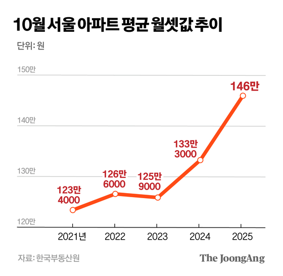한국부동산원에 따르면 지난달 서울 아파트 평균 월세는 146만원으로 2015년 7월 통계 작성 이래 최고치를 기록했다. KB부동산 발표한 월간 주택통계에 따르면 이달 서울 아파트 월세지수는 130.2로, 처음으로 130선을 넘었다. 관련 통계를 작성하기 시작한 2015년 12월 이후 역대 최고치다.