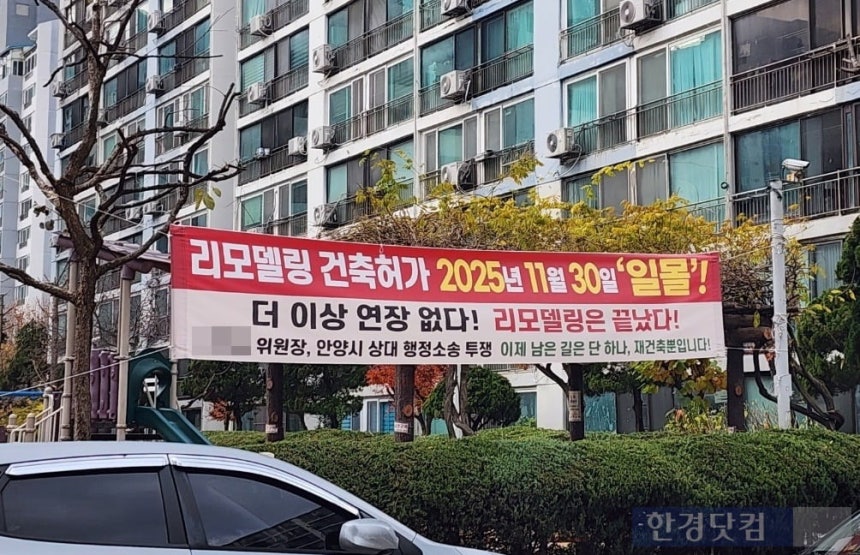 호계동 '목련2단지'에 리모델링 건축허가 일몰을 주장하는 현수막이 걸려 있다. 사진=오세성 한경닷컴 기자2007년부터 리모델링을 추진해 평촌 1호 사업장이던 호계동 '목련2단지'는 지난해 권리변동계획 확정 총회를 마무리하고 이주까지 계획하면서 리모델링 '9부 능선'을 넘었다는 평가를 받았다. 하지만 지난해 9월로 예정됐던 이주 시점이 1년 넘게 지났지만, 아직도 이주는 이뤄지지 않고 있다. 분담금이 당초 예상했던 것보다 배 이상 늘면서 리모델링에 반대하는 주민 목소리가 힘을 얻었고, 조합장 유고 사태로 인해 리모델링 사업 추진력은 떨어졌다.