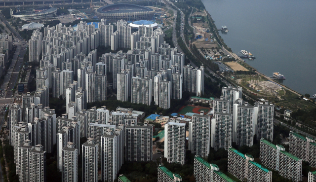 서울 송파구 롯데월드타워에서 바라본 한강변 아파트 단지. 뉴스1[서울경제]