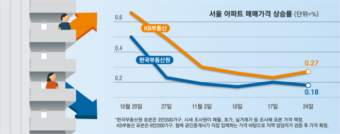 지난주에는 정부 통계가 ‘상승’인 반면 민간 통계는 ‘둔화’인 결과가 나왔다. 한국부동산원의 11월 셋째주 서울 아파트 매매가격 상승률(0.20%)은 전주(0.17%)보다 커지며 4주 만에 상승폭이 다시 확대됐다. 하지만 같은 기간 KB부동산은 상승률이 0.26%에서 0.23%로 줄어들며 5주 연속 상승폭이 둔화되는 결과가 나왔다.