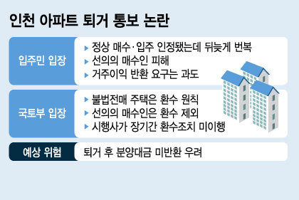 인천 서구 한 아파트에서 전매제한 기간 종료 후 분양권을 매수해 입주한 21가구가 3년 넘게 거주한 집을 비워야 할 위기에 처했다. 시행사가 입주 당시 '정당한 권리자'라며 문제없다고 안내했던 약속이 뒤집혔고, 환수 조치를 둘러싼 갈등이 격화됐다.