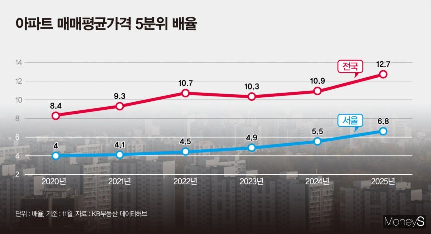 전국과 서울의 아파트 평균 5분위 배율이 사상 최대치를 기록했다. 두 수치 모두 상위 20%의 평균 가격의 상승이 끌어올린 결과다. /사진=강지호 디자인 기자 서울 아파트 평균 5분위 배율도 6.8배로 사상 최고치를 경신했다. 상위 20%의 평균 가격은 33억9165만원으로 2019년 11월(17억1744만원) 이후 약 2배 상승했다. 하위 20%의 평균 가격도 4억9723만원으로 6년 전(3억6524만원)보다 올랐다.