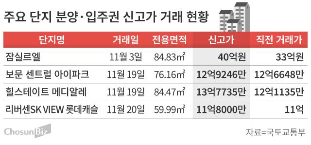 3일 국토교통부 실거래가 정보시스템에 따르면 서울 송파구 신천동의 ‘잠실르엘’ 전용면적 84.83㎡ 입주권이 지난 11월 3일 40억원에 거래됐다. 잠실르엘은 미성·크로바 아파트를 재건축해 지하 3층, 지상 35층 1865가구로 재건축한 단지로 2026년 1월 입주를 앞두고 있다. 같은 평형이 지난 9월 2일 33억원에 거래됐는데 2개월 만에 7억원이 급등했다. 11월 거래된 곳은 저층부인 4층이고 9월 거래된 곳도 2층 저층부다.