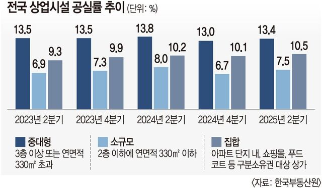 3일 알투코리아부동산투자자문의 ‘12월 부동산 마켓 브리프’에 따르면 국내 상업용 부동산은 집합상가 10%대, 중대형 상가 13%대의 높은 공실률이 굳어지고 있다. 올해 2분기 기준 전국 상업 시설별 공실률은 중대형 상가가 13.4%, 집합상가 10.5%, 소규모 상가는 7.5%를 기록했다. 지방과 수도권 신도시에선 공실률이 20%를 웃도는 ‘유령 상가’ 현상이 발생하고 있다. 중대형 상가는 세종(26.7%)과 충북(20.2%)에서, 집합상가는 울산(21.4%), 전남(23.2%), 경북(26.7%)에서 공실률 20%를 넘어섰다.