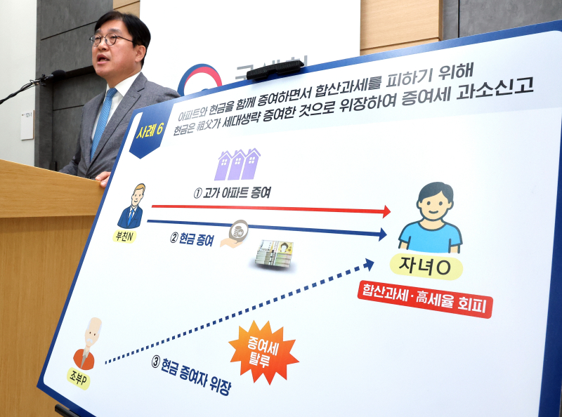 부친이 고가 아파트를 미성년 자녀에게 증여하면서 증여·취득세 납부를 위한 현금 수십억원도 함께 줬지만, 아파트와 현금이 합산돼 높은 세율이 적용되는 것을 피하기 위해 현금은 조부가 세대 생략 증여하는 것처럼 위장 신고하는 식이다.