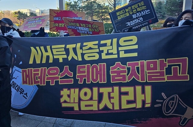 그러면서 "금융사는 수익을 챙기고 서민은 집을 잃게 생겼다"며 "NH투자증권은 메테우스자산운영의 신탁업무를 중지하라"고 촉구했다.