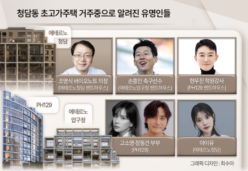 아이유가 사는 곳으로 알려진 ‘에테르노 청담’의 슈퍼 펜트하우스 소유주는 조영식 SD바이오센서 회장이다. 이 곳 또한 2021년 분양가 300억원으로 국내 최고가를 기록해 화제가 됐다. 조 의장의 회사는 코로나19 자가진단키트 제조업체로, 팬데믹 기간 동안 1조4000억원대의 순이익을 남겨 화제가 됐다. 에테르노 청담은 배틀그라운드 개발자로 알려진 김창한 크래프톤 대표, 이승건 비바리퍼블리카 대표, 한성수 플레디스엔터테인먼트 대표 등이 매입한 것으로 알려져있다.
