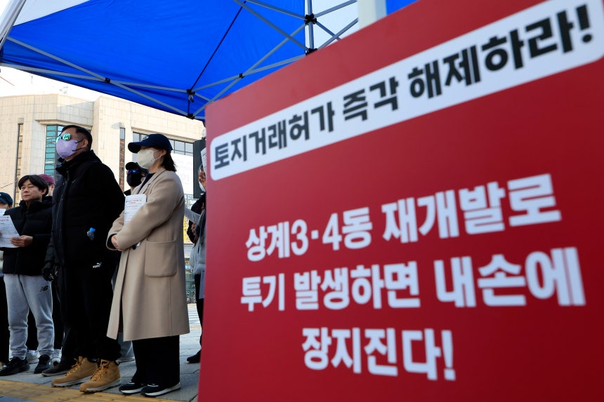 노원미래도시정비사업추진단과 노원구민들이 지난달 22일 오후 서울 노원구 롯데백화점 앞에서 토지거래허가제 즉각 해제 촉구 집회를 하고 있다. /뉴스1